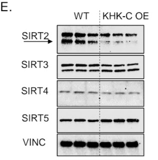 | Increasing the amount of the enzyme processing fructose (KHK-C OE) turns off the deacetylase SIRT2 and affects dozens of enzymes by not removing their specific "decoration" with an acetyl group. |